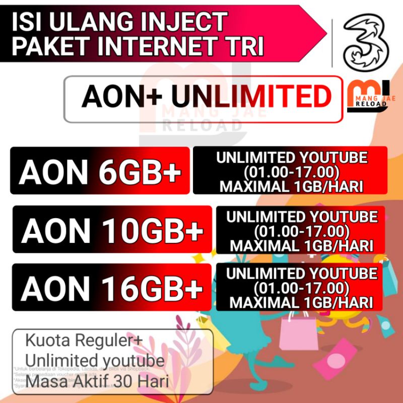 ----- waktu transaksi 0800 - 2000 wib. Paket Tri Unlimited AON hadir untuk memberi pengalaman internet yang memuaskan kepada pelanggan. Daftar Paket AOn yang sudah mendapat akses unlimited youtube mulai dari Aon 3GB Aon 4GB Aon 5GB Aon 6GB Aon 8GB dan Aon 10GB.