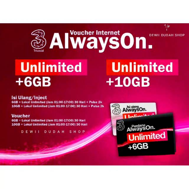 Produk AlwaysOn Unlimited 6GB dari Tri Terbaru Provider Tri Indonesia produk baru di dalamnya paket tersebut ada paket internet dengan dua kuota di dalamnya. Menariknya lagi harga paket Unlimited 3 AlwaysOn sangat murah. Valid for 30 days.
